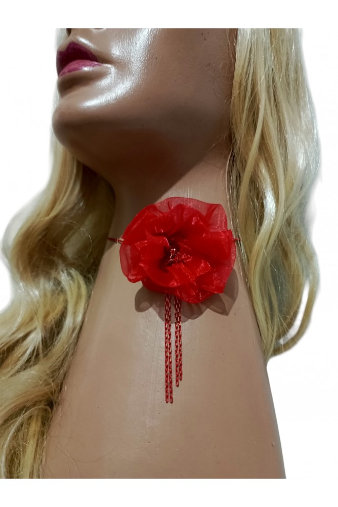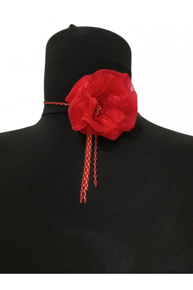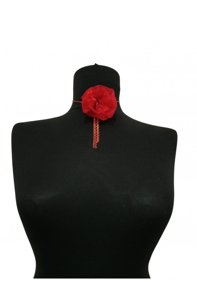 Organze tül ile elde yapılmış kırmızı çiçek detaylı boyunluk tasarımıdır.