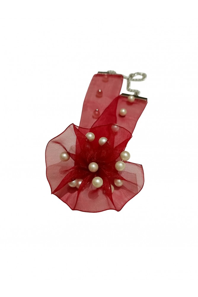 Zarafetin ve dikkat çekiciliğin birleştiği bu özel tasarım choker kolye, kırmızı organze tül üzerine zımbalı yapay inci detaylarıyla tasarlanmıştır. El yapımıdır.