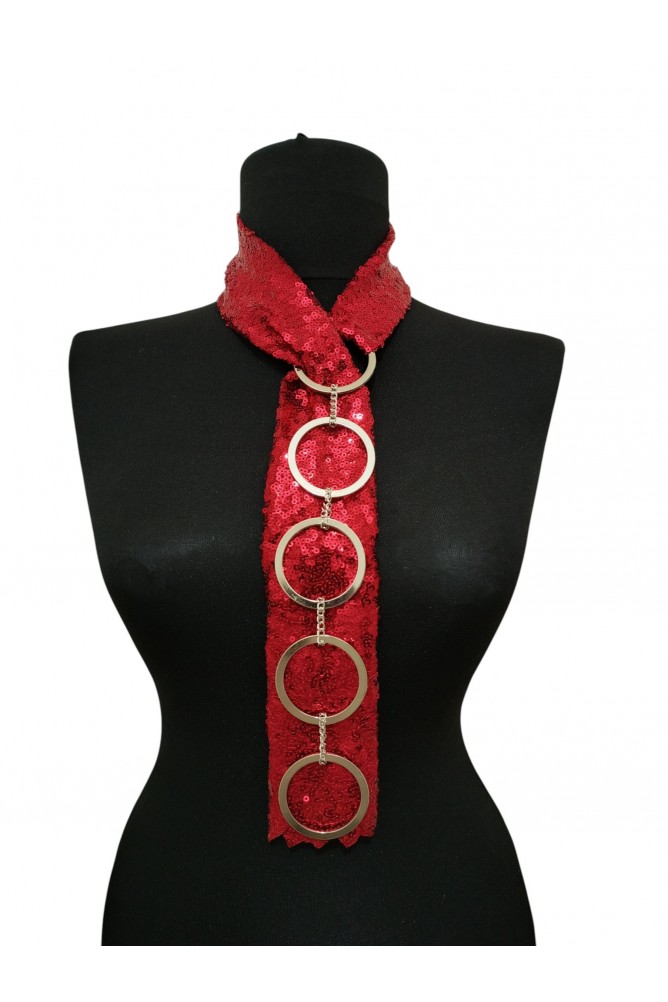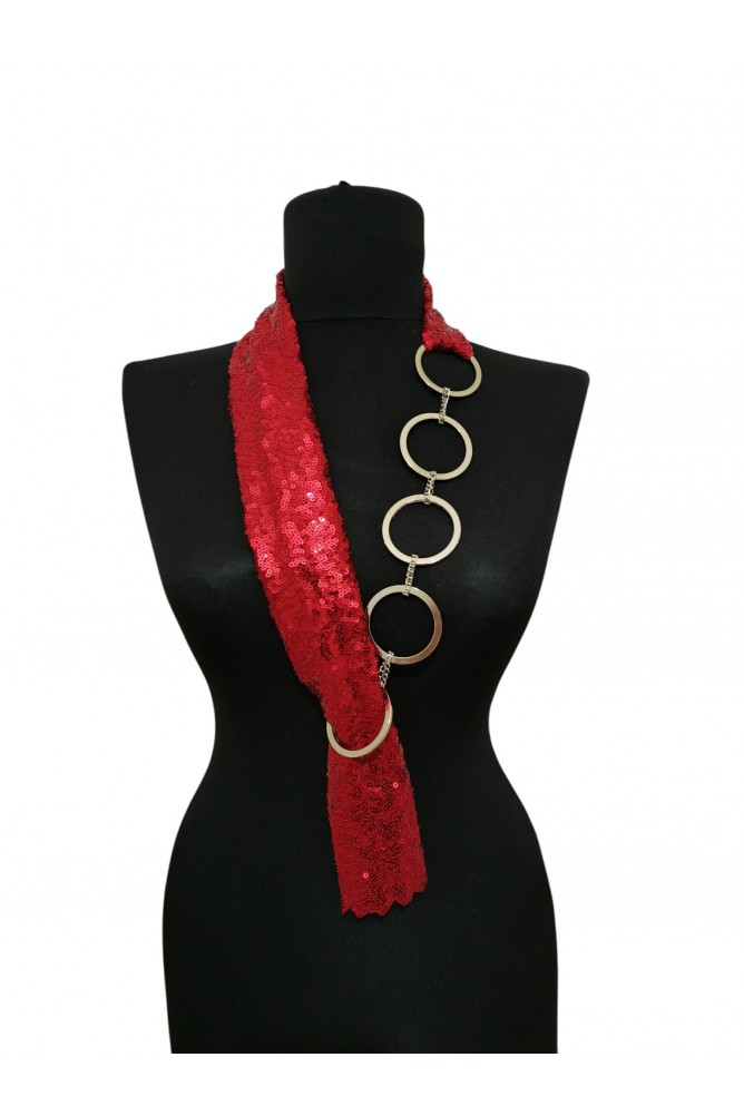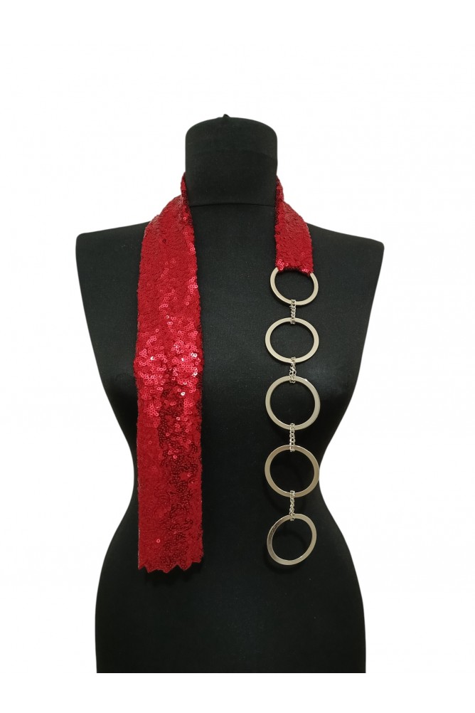 Sahneye, özel davetlere ve stilini konuşturmak isteyen kadınlara özel olarak tasarlanmış bu kırmızı payet boyunluk kolye, iddialı görünümüyle dikkat çeker.