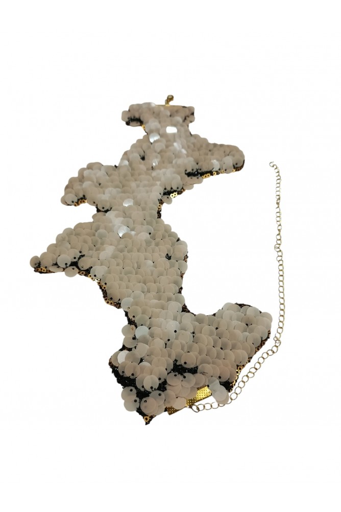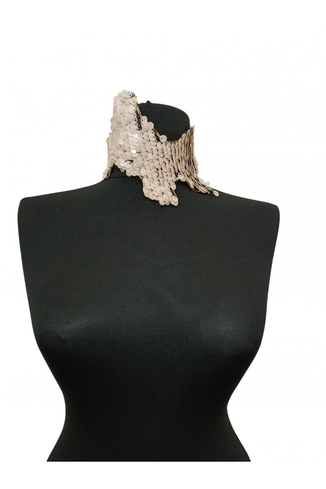 Polyester destekli kumaş, pudra tonlu plastik pullar, ayarlanabilir metal zincir.