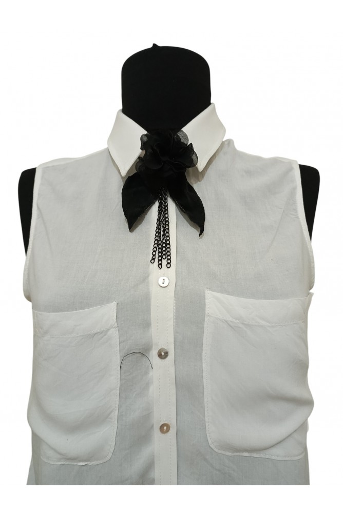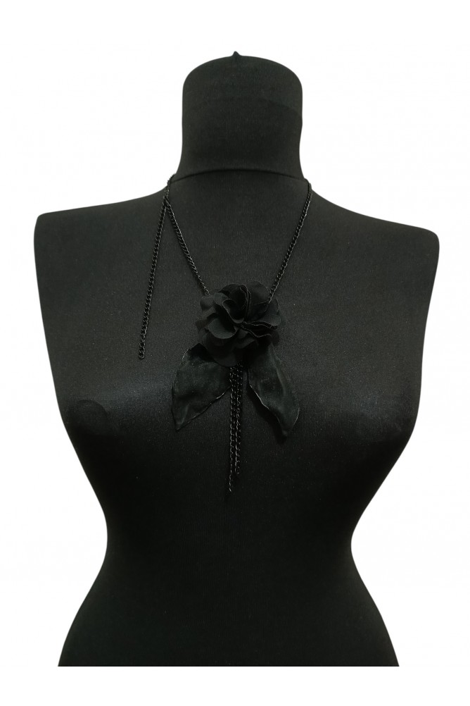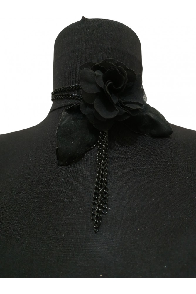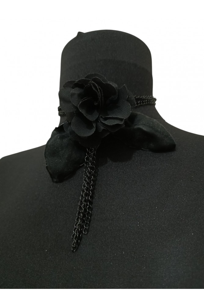 Çiçek detayının alt kısmından sarkan 4 adet siyah zincir, yaklaşık 10 cm uzunluğundadır ve ürüne hareketli, şık ve modern bir dokunuş katar. Çiçek kısmında krep şifon tül görünümlü kumaş kullanılmıştır. Yaprak detayları ise hafif tüylü doku hissi veren polyester süet kumaştan hazırlanmıştır.