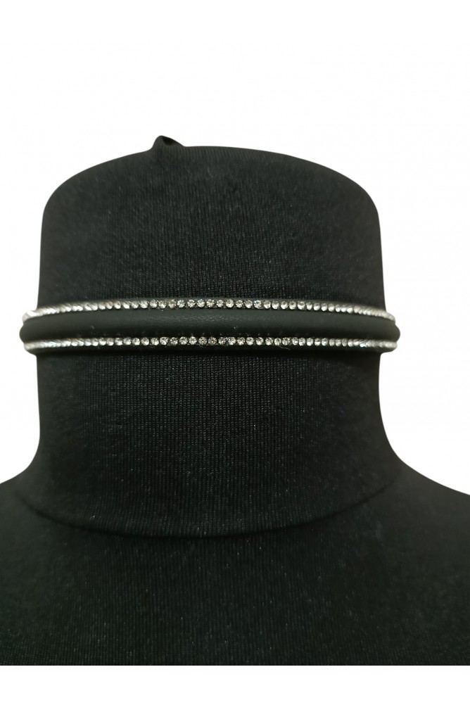 55 cm uzunluğundaki zincir tek başına veya çiçek detayı ile birlikte kullanılabilir. Deri görünümlü sentetik şerit bölümün ön yüzünde kristal silikon yapıştırma taşlar yer alır. Arka yüzü ise sade siyah olarak kullanılabilir. Bu özellik sayesinde ürün hem daha gösterişli hem de daha sade stillere uyum sağlar.
