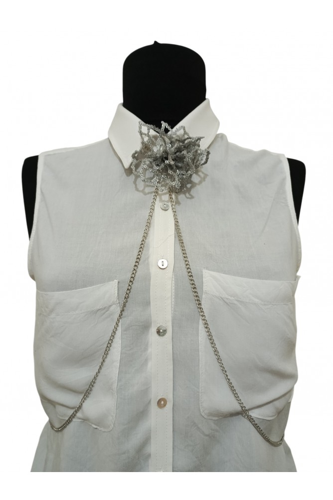 Tasarımın merkezinde yer alan yaprak çiçek detayı, ürünün en belirgin ve özel bölümünü oluşturur. Hayal tül üzerine uygulanan pul işlemeli kumaş dokusu, çiçeğe hareketli ve dikkat çekici bir görünüm kazandırır. Metal zincirle birleşen bu form, ürüne hem güçlü hem de farklı bir duruş verir.