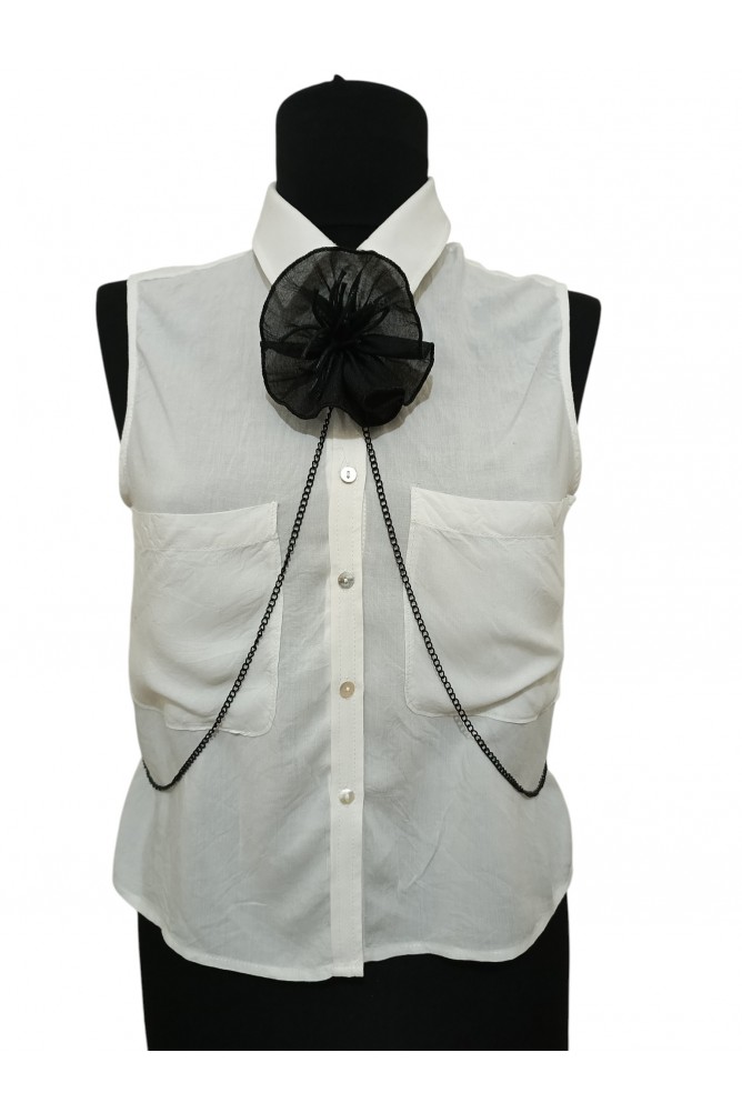 Tasarımın merkezinde yer alan büyük çiçek detayı, ürünün en belirgin ve özel bölümünü oluşturur. Şifon tül kullanılarak hazırlanan çiçek formu, ürüne hafif, zarif ve hareketli bir görünüm kazandırır. Çiçeğin iç kısmında kullanılan pamuk ip detayları tasarıma farklı ve özgün bir doku katar. Metal zincirle birleşen bu form, tasarıma hem güçlü hem de farklı bir duruş verir.